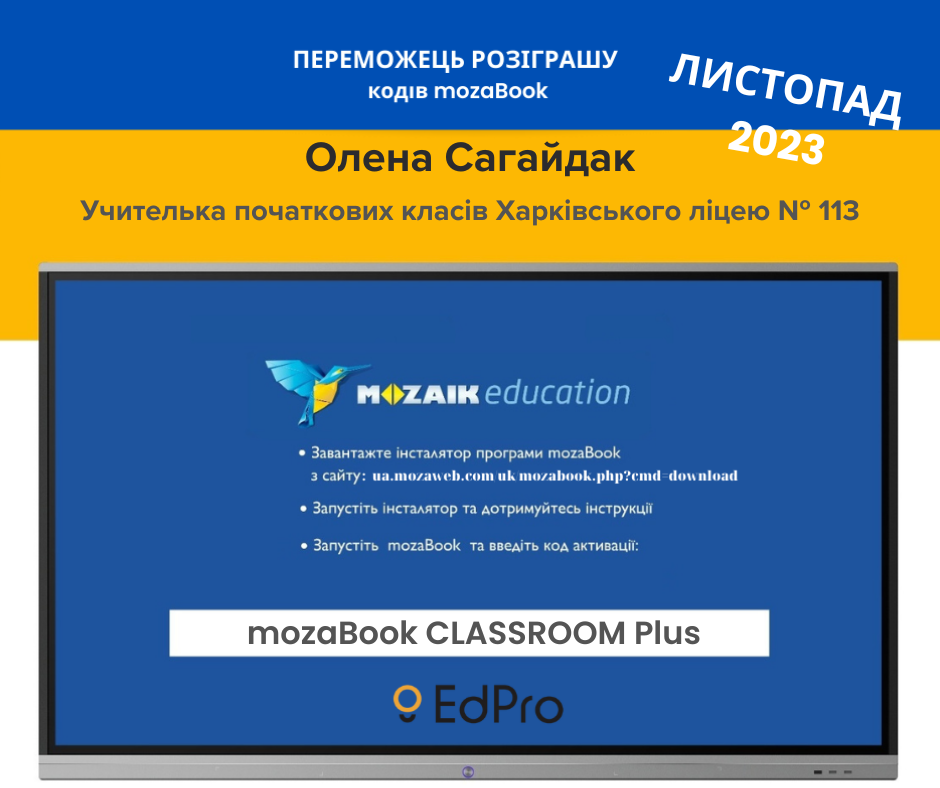Право користуватися програмою Мозабук протягом року отримала учителька початкових класів з Харкова Олена Сагайдак, за результатами розіграшу у листопаді. Бажаємо переможцям, а це насамперед усі учні пані Олени, найкращих уроків із навчальною програмою Мозабук.