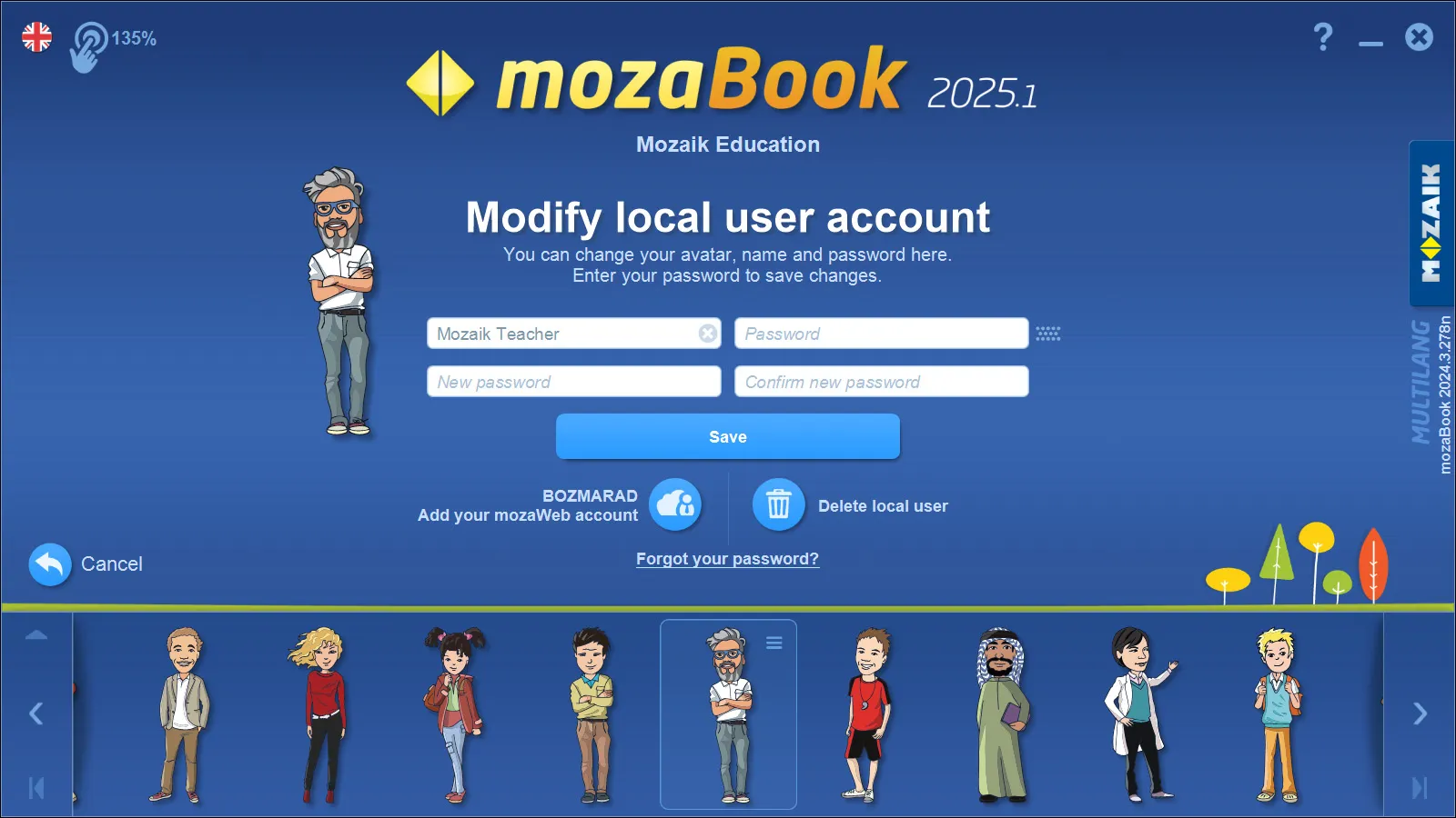 mozaBook дозволяє декільком користувачам використовувати програмне забезпечення на одному комп'ютері (наприклад, декільком вчителям в одному класі). Малюнки, нотатки, презентації та контент, створені та вставлені в програму, завжди зберігаються в обліковому записі активного локального користувача, тому вони будуть видимі лише йому. Тому необхідно, щоб програма могла ідентифікувати локальних користувачів.